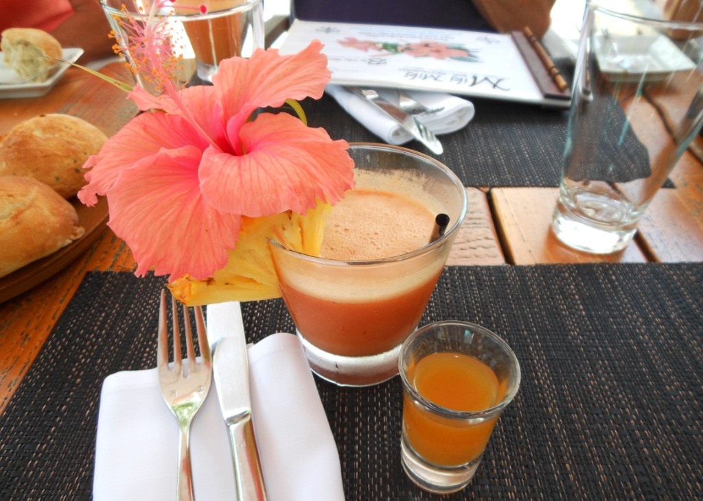 Fruity tropical drink with a side shot of fruity tropical drink. With more flowers!
