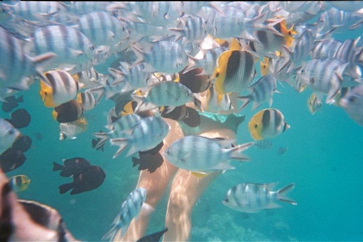 Today, with Christophe the hunky Frenchman (tan, charming, hot, had a big motorboat and even knew stuff about fish!) on our Reef Discovery Tour, we saw the most amazing coral reefs, swam for a good ten minutes with a 6′ wide manta ray (he looked like a space ship and had TWO penises), fed about a bazillion brilliant colored fish and hung out with a humongous 6′-7′ moray eel that reminded me of that space worm that eats star fighters in Star Wars. Bad assery all around.